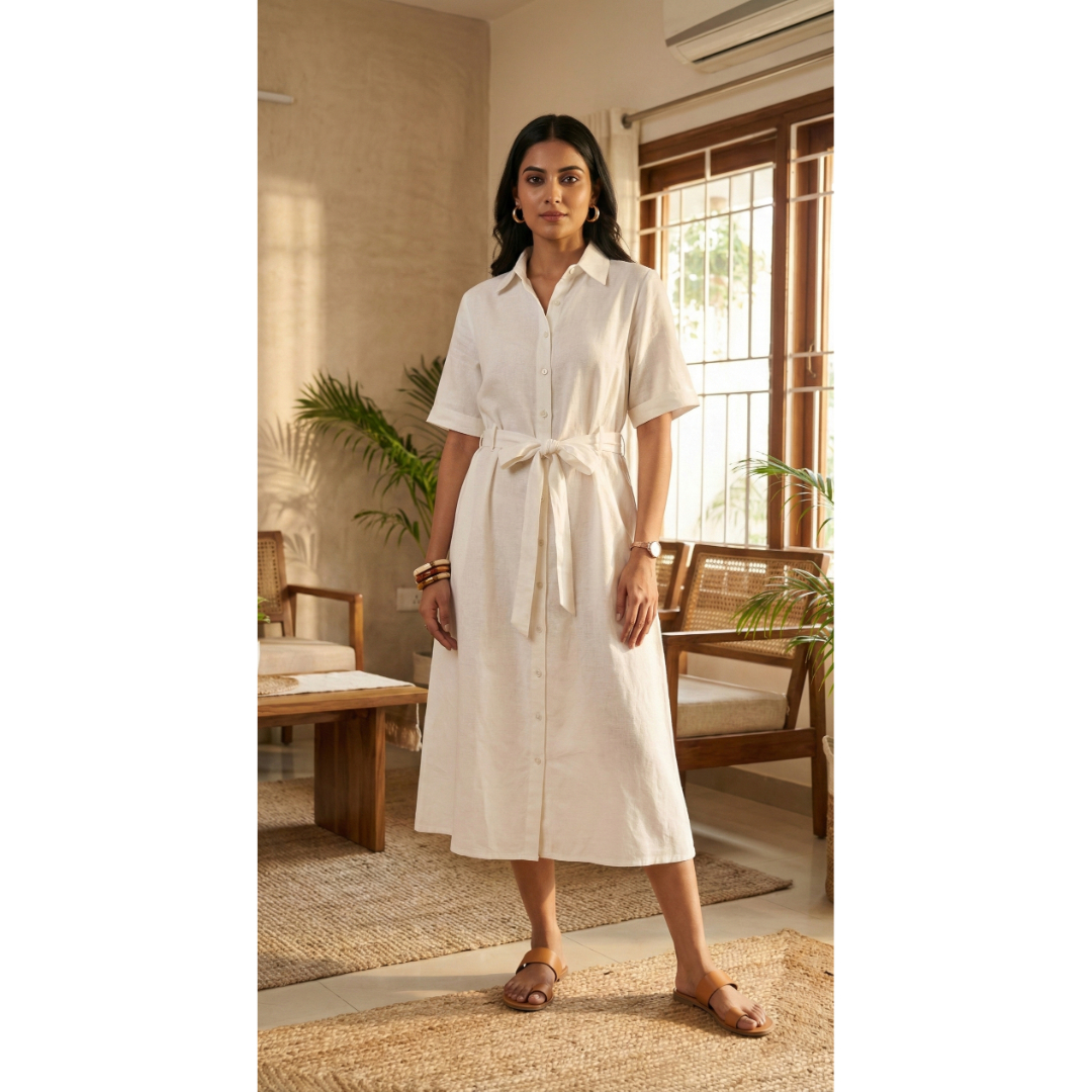 Alabaster Linen-Blend Belted Midi Shirt Dress