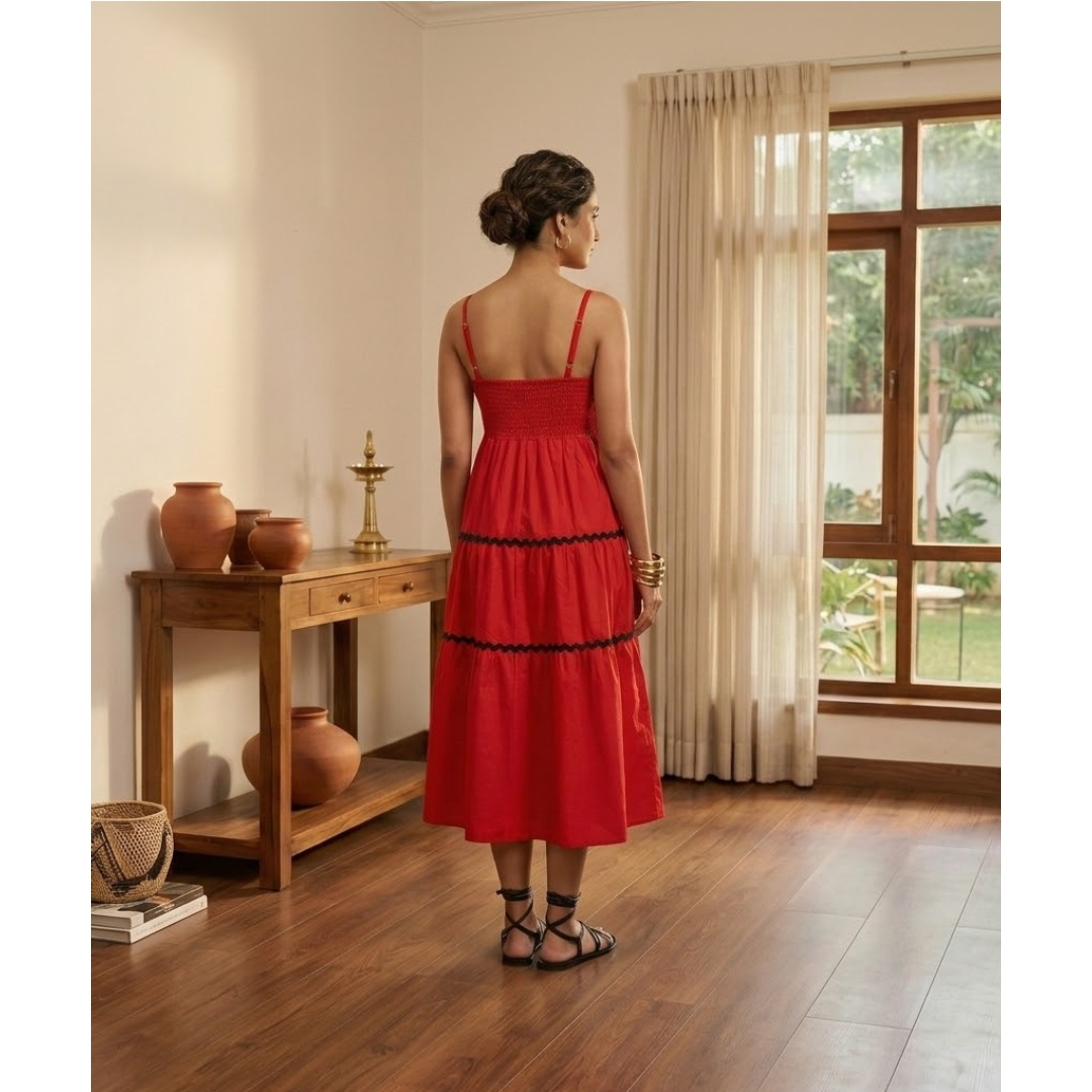 Make a statement in our Crimson Ember Ric-Rac Tiered Midi Dress, a captivating blend of bold color and artisanal detail. The fiery red hue is beautifully grounded by black ric-rac accents, creating a high-contrast look that is both playful and sophisticated. With its breathable fabric and effortless silhouette, this dress is designed to keep you feeling cool while looking undeniably chic.