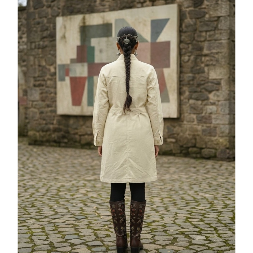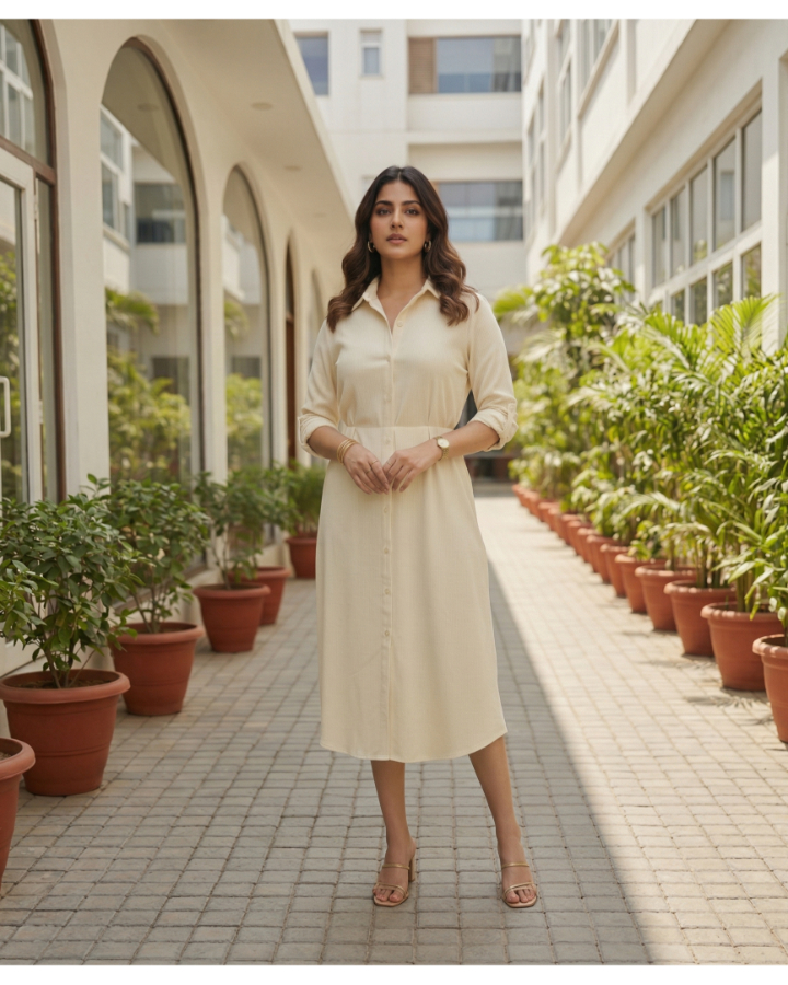 Upgrade your wardrobe with this stylish beige corduroy shirt dress designed for a chic and effortless look. Crafted from soft, textured corduroy fabric, this dress features a classic collar, full front button closure, and full-length sleeves for a smart yet comfortable fit. The tailored stitching enhances the silhouette, making it perfect for casual outings, office wear, or weekend brunch.