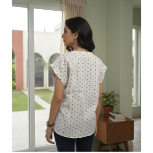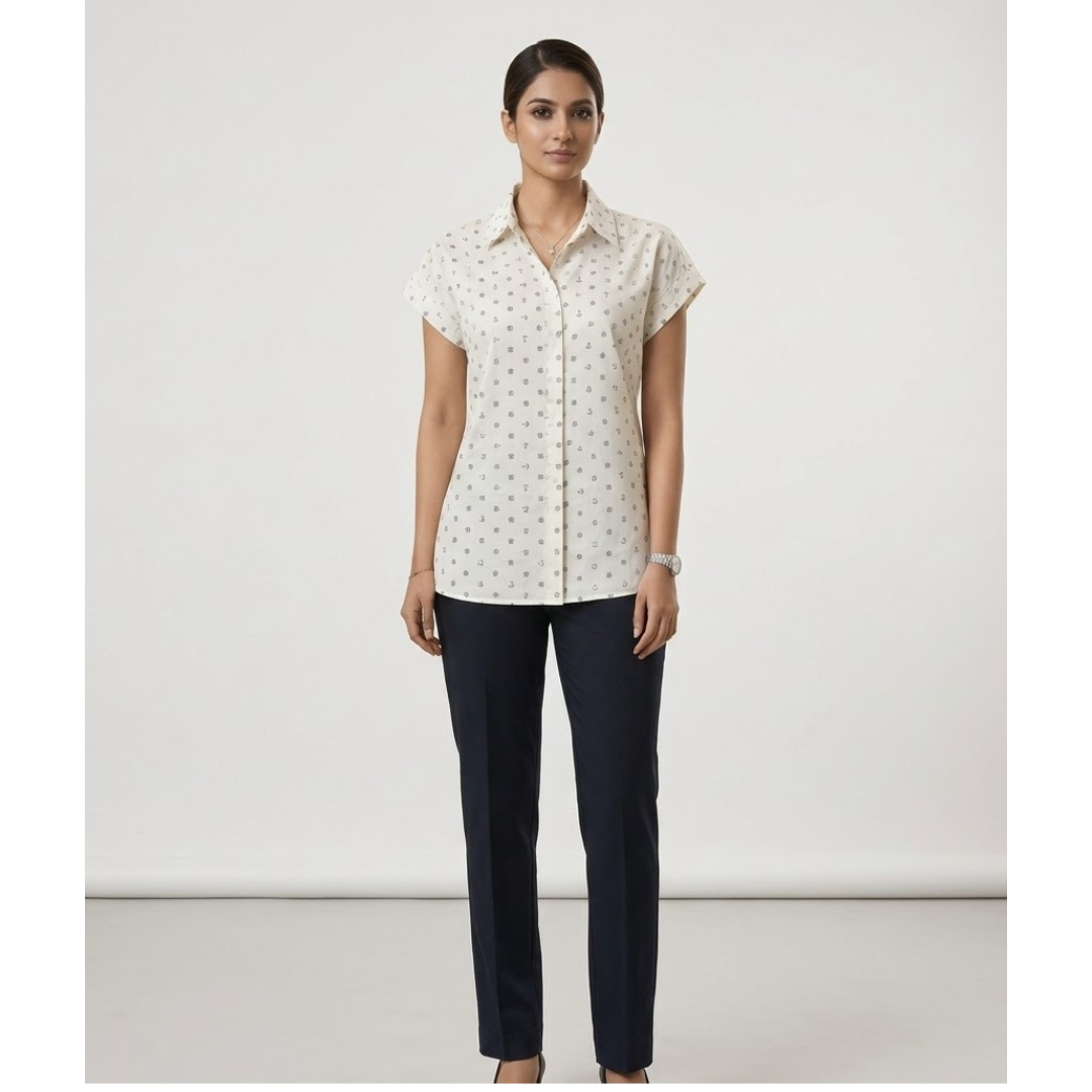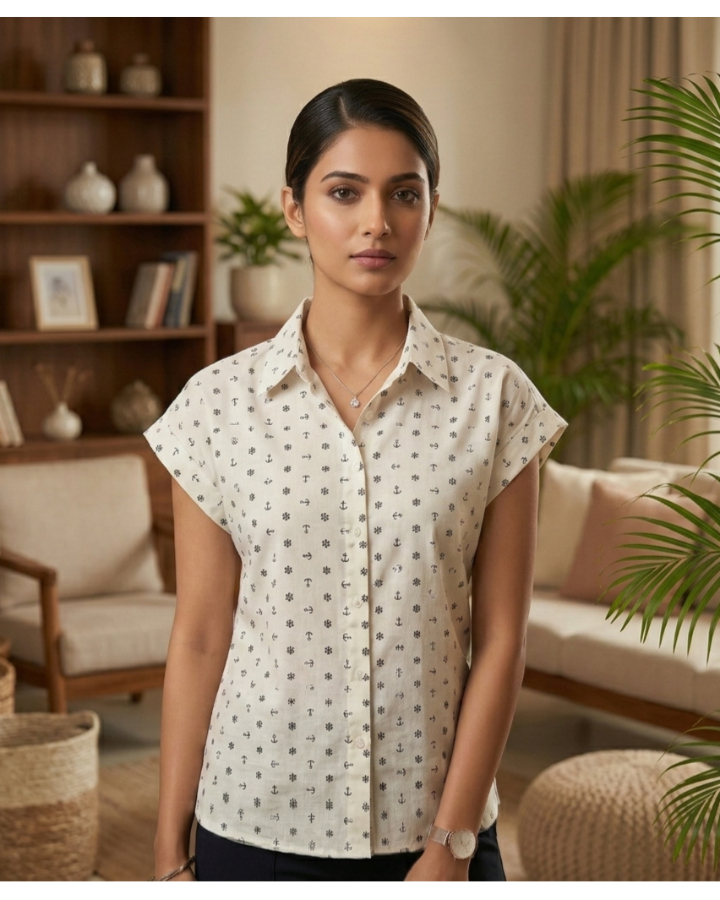 Upgrade your everyday wardrobe with this elegant cream printed shirt for women. Designed with a subtle all-over anchor and floral pattern, this cap sleeve top offers a perfect blend of comfort and sophistication. The button-down front and structured collar create a polished look, making it ideal for office wear, casual outings, or smart everyday styling.