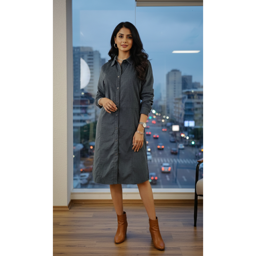 Elegant Navy Blue Button-Down Shirt Dress for Women | Full Sleeve Casual Midi Dress
