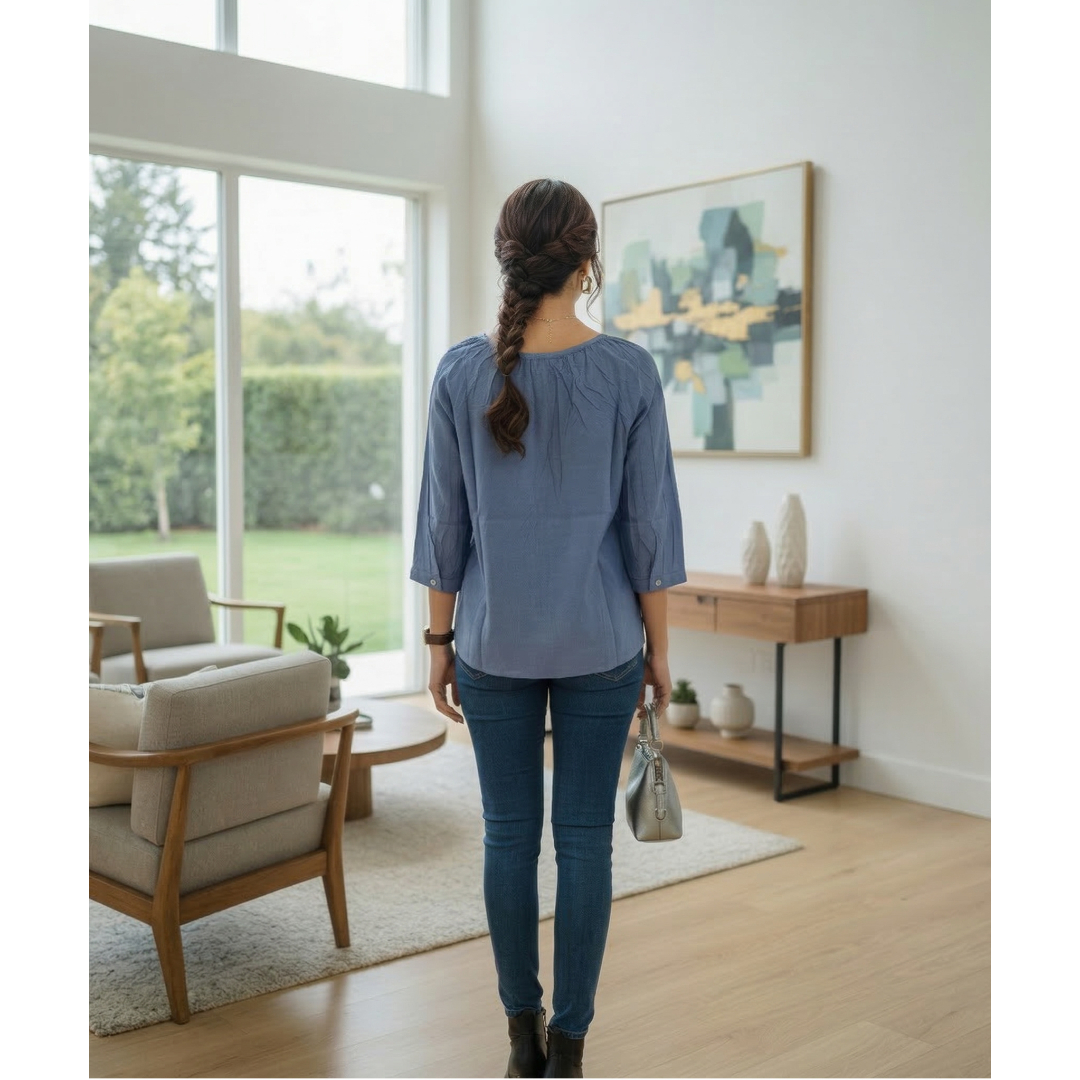 Upgrade your everyday wardrobe with this elegant solid blue cotton top designed for comfort and effortless style. Featuring a classic round neckline with button detailing and 3/4 sleeves, this versatile tunic is perfect for daily wear, office, or casual outings.