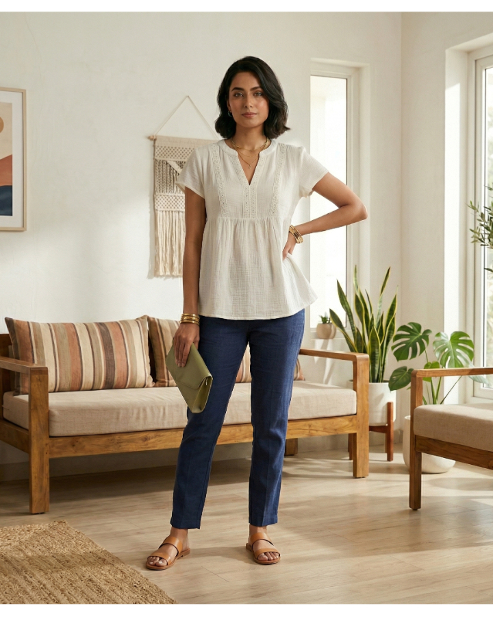Upgrade your everyday style with this elegant white cotton top designed for comfort and effortless charm. Crafted from soft, breathable fabric, this top features delicate lace panel detailing on the front that adds a feminine and classy touch. The flattering V-neckline and short sleeves make it perfect for daily wear, office looks, casual outings, or summer styling.