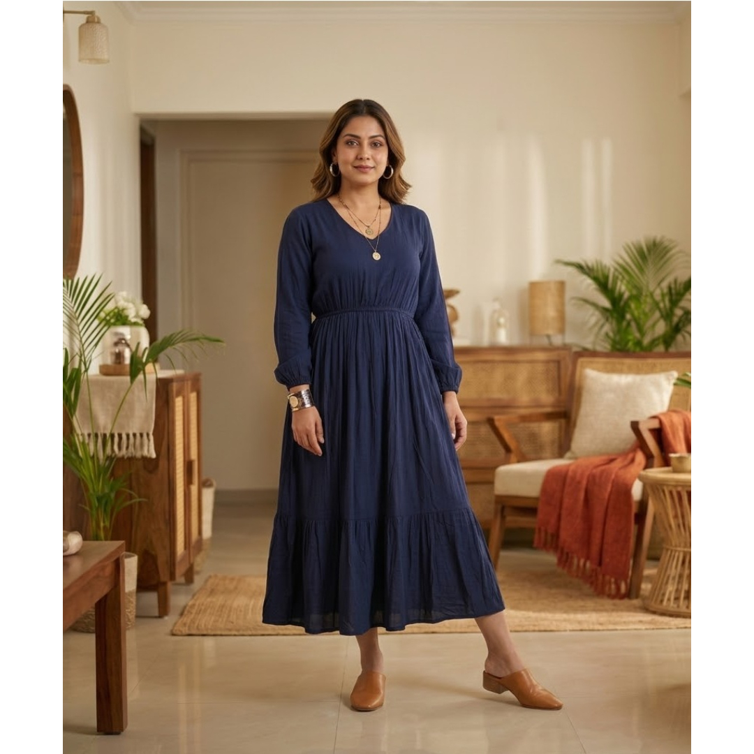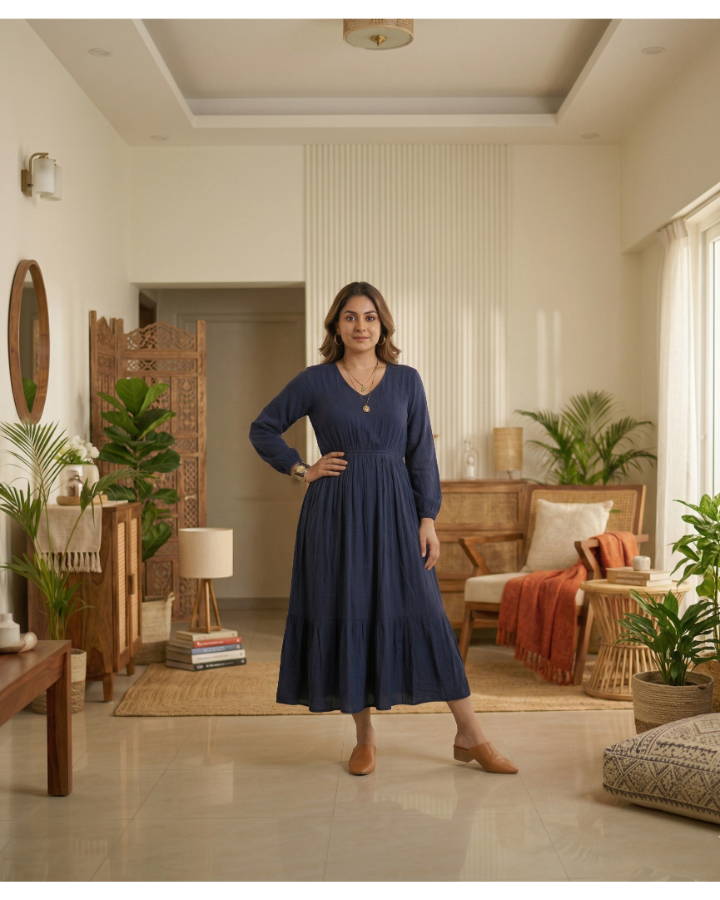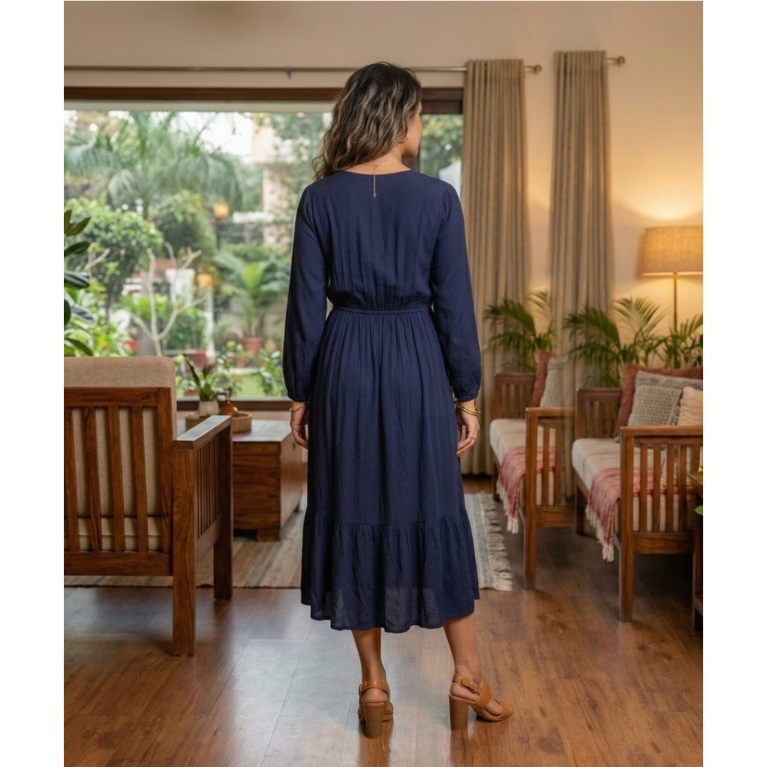 Embrace understated elegance with our Midnight Indigo Smocked Tiered Midi Dress. Crafted from a rich, textured fabric in a deep navy hue, this dress is designed to offer a flattering silhouette without compromising on all-day comfort. Whether you’re heading to a creative meeting or a casual dinner, its classic aesthetic makes it an effortless choice.