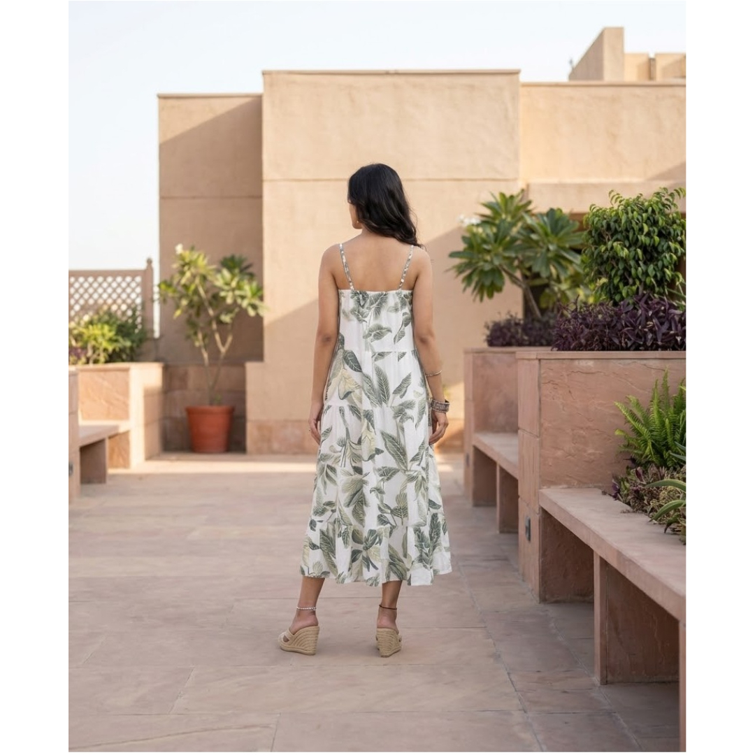 Description: Embrace earthy elegance. This midi dress features a dense, impressionist-style abstract print in shades of moss green and brown. Its rustic charm is perfect for transitional weather?styled here with boots for a modern bohemian look. The fabric drapes beautifully, making it a wardrobe staple for those who love understated, nature-inspired fashion.