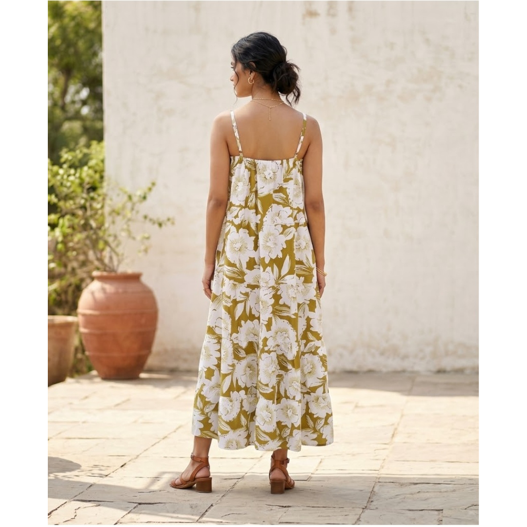 Earthy Olive Abstract Floral Midi Dress