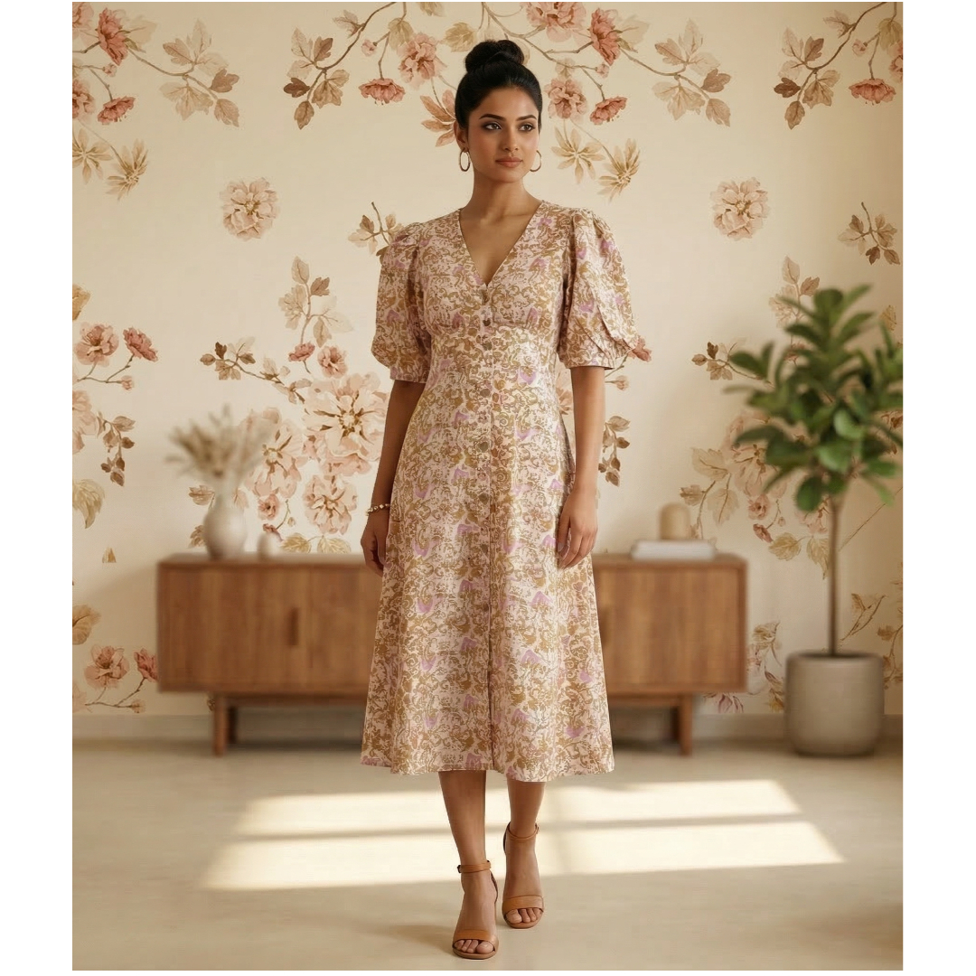 Crafted from premium, breathable cotton, the Sienna Midi features an intricate ochre and blush botanical print that feels both vintage and fresh. The structured V-neckline and button-down front provide a tailored look, while the dramatic elbow-length puff sleeves add a touch of contemporary high-fashion volume.