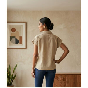 Upgrade your everyday wardrobe with this elegant beige linen blend shirt for women. Designed with a classic collared neckline and front button-down closure, this top offers a perfect balance of comfort and style. The short rolled sleeves add a relaxed touch, making it ideal for casual outings, office wear, or weekend get-togethers.