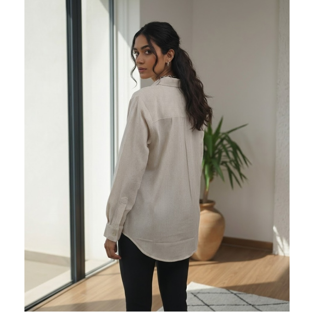 Upgrade your everyday wardrobe with this elegant beige striped shirt for women. Designed with a timeless collared neckline and full button-down front, this shirt offers a clean and polished look suitable for both casual and semi-formal occasions. The subtle vertical stripe pattern adds a touch of sophistication while enhancing the overall silhouette.