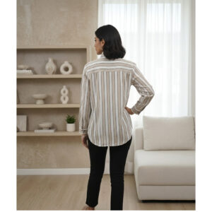 Upgrade your everyday wardrobe with this elegant beige and white vertical striped shirt for women. Designed with a classic collar and full-length sleeves, this button-down top offers a perfect blend of comfort and sophistication. The vertical stripe pattern gives a slim and flattering look, making it ideal for both office wear and casual outings.