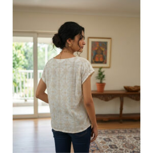 Add effortless elegance to your everyday wardrobe with this beautiful cream and gold printed top. Designed with a flattering V-neckline and delicate front tie detail, this top combines comfort with a refined, feminine touch. The subtle geometric print in soft gold tones enhances its sophisticated appeal, making it perfect for both casual outings and semi-formal occasions.