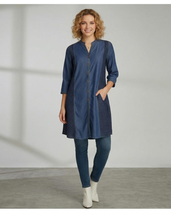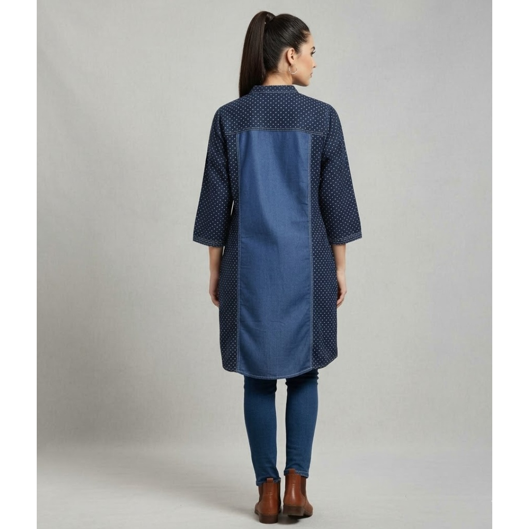 Upgrade your everyday wardrobe with this stylish women?s denim kurti, designed with a unique combination of solid and printed panels. The center features classic blue denim with a full button-down front, while the side panels showcase a subtle dotted print for a trendy contrast look. The mandarin collar and 3/4 sleeves add a modern touch, making it perfect for both casual outings and office wear.