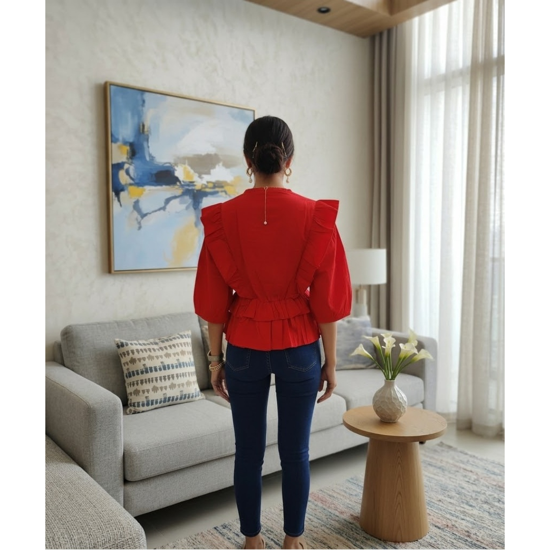 Make a bold style statement with this elegant red wrap-style top designed to flatter your silhouette. Featuring a graceful V-neckline and layered ruffle detailing along the shoulders and waist, this peplum-style blouse adds a feminine and sophisticated touch to your look.
