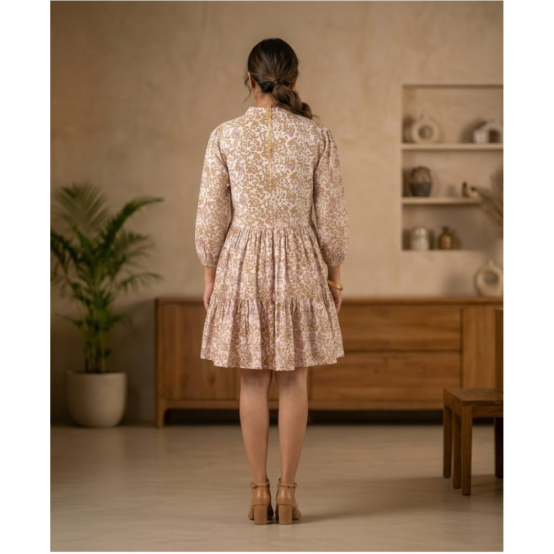 Women’s Floral Damask Button-Down Mini Dress ? 3/4 Sleeve Collared Tiered Tunic Dress with Ruffle Detail