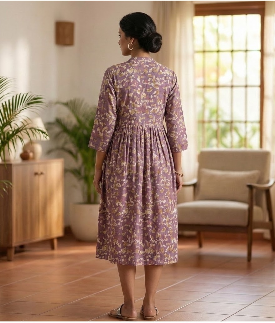 Discover effortless elegance with our Mauve Floral Midi Dress. This piece features a charming botanical print on a soft purple canvas, designed with a gathered waistline that creates a comfortable and flattering A-line silhouette. Perfect for casual days or intimate gatherings, the dress offers a breezy fit that looks graceful from every angle.