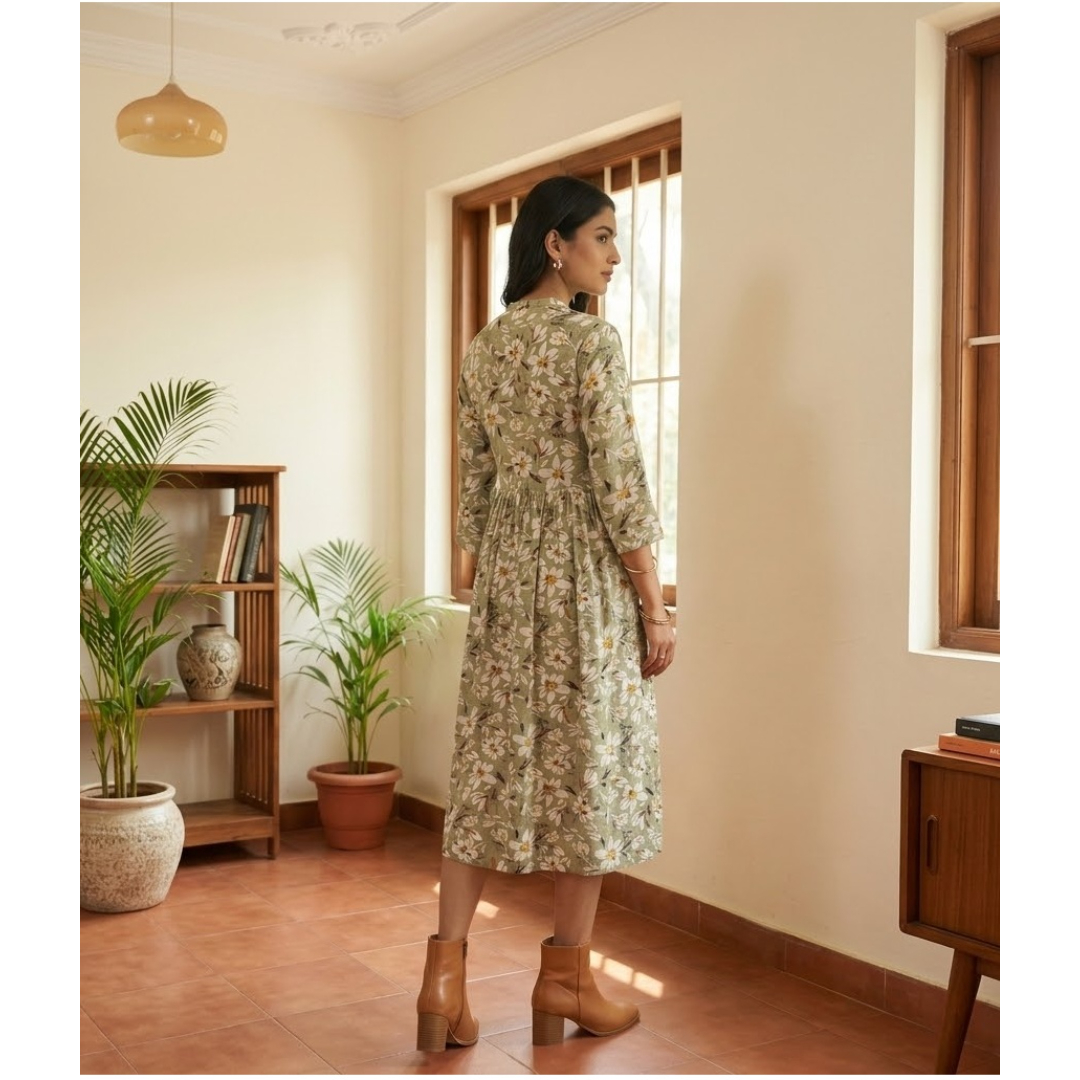 Elevate your everyday wardrobe with this effortless Sage Green Floral Fusion Dress. Designed for the modern woman, this midi-length dress features a flattering V-neckline and an empire waist with gentle gathers that create a breezy, comfortable silhouette. The white botanical print against the soft olive-green backdrop offers a refreshing, nature-inspired look perfect for all seasons.