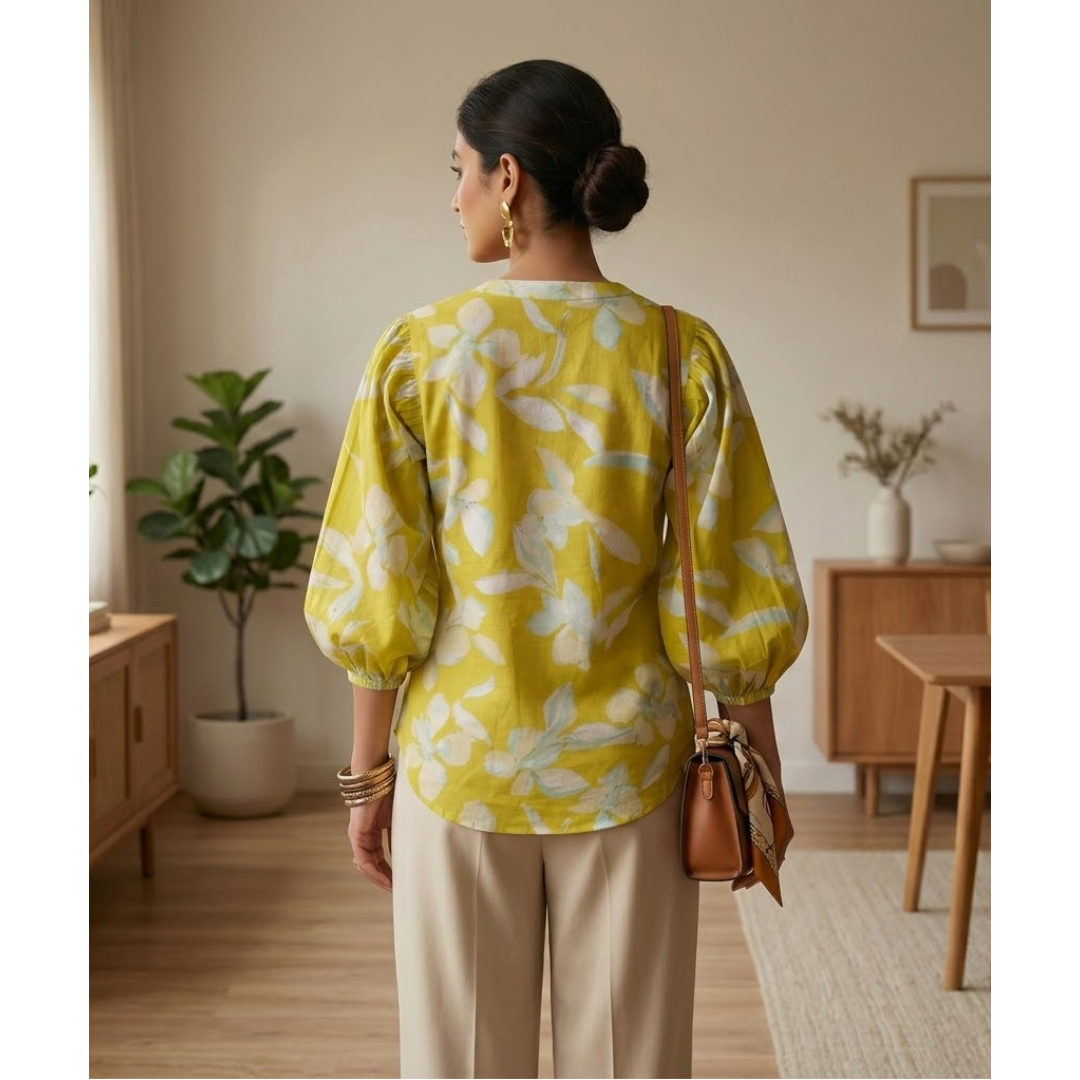 Brighten up your everyday wardrobe with this elegant yellow floral printed top for women. Designed in a soft and breathable cotton fabric, this stylish shirt features a front button-down closure and a round neckline for a clean, minimal look. The statement puff sleeves with gentle gathers add a touch of modern charm, making it perfect for both casual outings and semi-formal occasions.