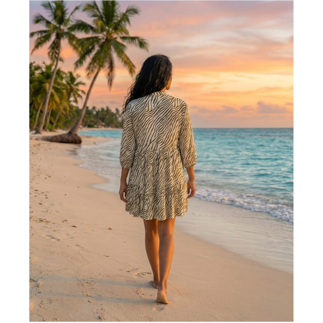 Step into effortless elegance with this stylish zebra print beach dress, designed for comfort and charm. Featuring a relaxed fit silhouette with soft tiered layers, this mini dress offers a breezy and flattering look perfect for vacations, casual outings, and beach days. The 3/4 sleeves and V-neckline add a touch of sophistication, while the lightweight fabric ensures all-day comfort in warm weather.